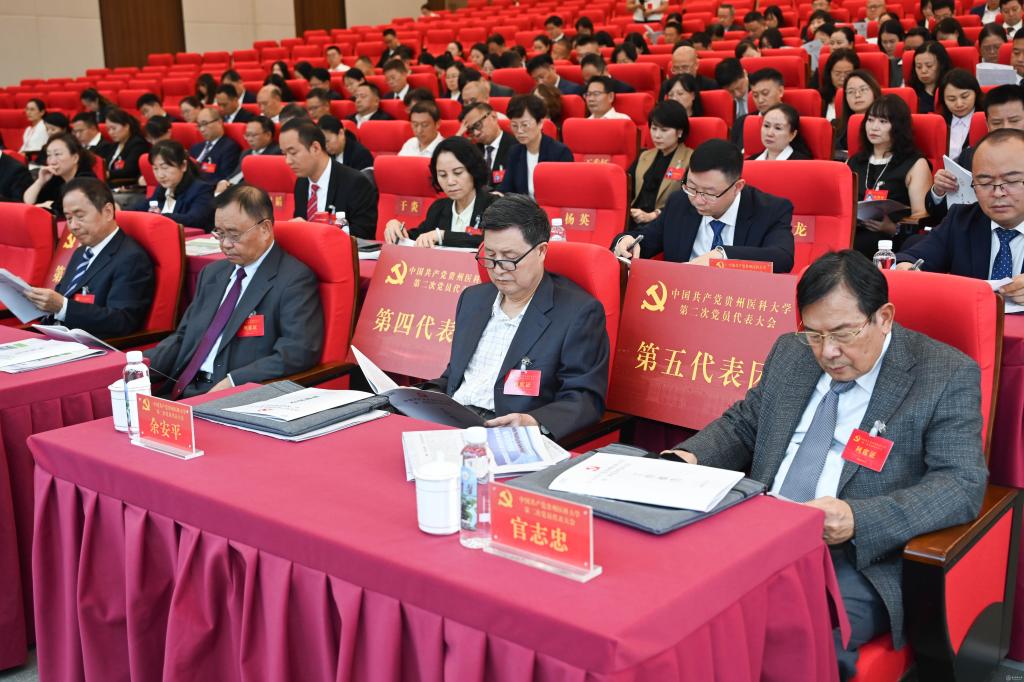 会场内气氛庄严热烈。主席台上方悬挂着“中国共产党贵州医科大学第二次党员代表大会”的会标,镰刀锤头组成的中国共产党党徽悬挂在正中,熠熠生辉;十面鲜艳的红旗分列两侧,交相辉映。会场内悬挂“凝心聚力担使命,砥砺奋进谱新篇,为建设特色鲜明、同类先进、国内一流的高水平医科大学而团结奋斗!”的主题横幅。