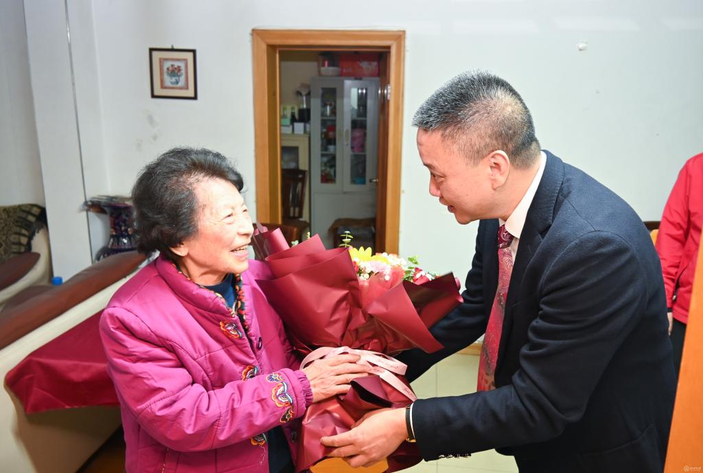 校领导依次为满70 岁、80 岁、90 岁的老同志代表送上鲜花、生日慰问金与蛋糕。慰问过程中,校领导关切询问老同志生活起居与健康状况,为老同志代表发放“重阳节”慰问品,将关怀与温暖送到老同志手中。老同志们满怀感动,纷纷表达对学校的感激之情。