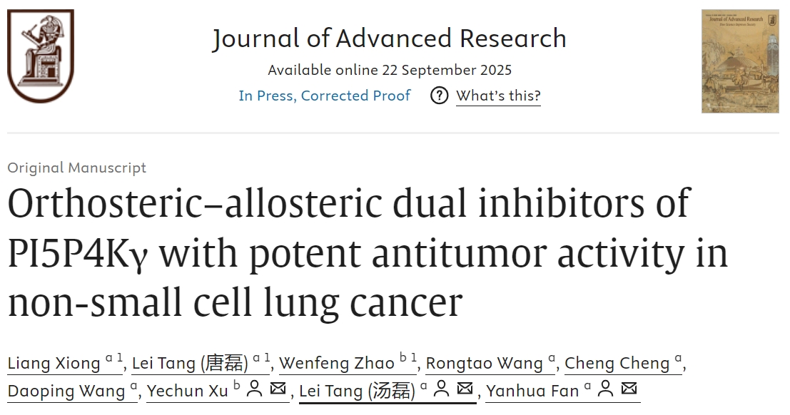 近日,我校中药功效成分发掘与利用全国重点实验室汤磊/范艳华团队在国际期刊《Journal of Advanced Research》(中科院一区TOP期刊,影响因子13.0)上发表研究论文《Orthosteric-allosteric dual inhibitors of PI5P4Kγ with potent antitumor activity in non-small cell lung cancer》,发现一类针对PI5P4Kγ的正构-变构双位点抑制剂,该抑制剂在NSCLC模型中表现出显著的抗肿瘤活性。