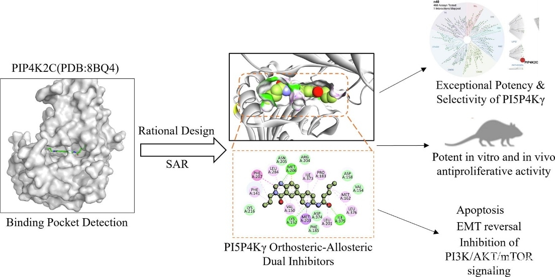 NSCLC是一种最普遍且高侵袭性的癌症,占肺癌的85%,目前仍然是死亡率最高的癌症之一。尽管靶向治疗取得了进展,但许多NSCLC患者缺乏持久的治疗方法,这凸显了对新的药物靶点的需求。磷脂酰肌醇-5-磷酸4-激酶(PI5P4Ks)是一类脂质激酶,对磷脂酰肌醇4,5-二磷酸的合成有重要作用,其中PI5P4Kγ是PI5P4Ks三种亚型中的激酶活性较弱的一种亚型。近年来,随着PI5P4Kγ对肿瘤细胞生存、自噬和免疫等生理过程的重要调控作用被证实,引起了研究人员的广泛关注。研究证实,当敲除PI5P4Kγ时,不仅不影响小鼠的生长发育、代谢机能及其寿命,而且还能增强小鼠免疫功能,表明PI5P4Kγ具有较高的靶点安全性。目前靶向PI5P4Kγ的选择性抑制剂的研究较少,已知的PI5P4Kγ抑制剂主要针对其正构位点及变构口袋设计,然而,此类PI5P4Kγ抑制剂在抗肿瘤活性方面仅显示出微摩尔效价(IC50>1.0 μM),而且缺乏体内验证,因此迫切需要开发新的PI5P4Kγ抑制剂来全面评估PI5P4Kγ抑制剂作为新型肿瘤治疗药物的潜力。