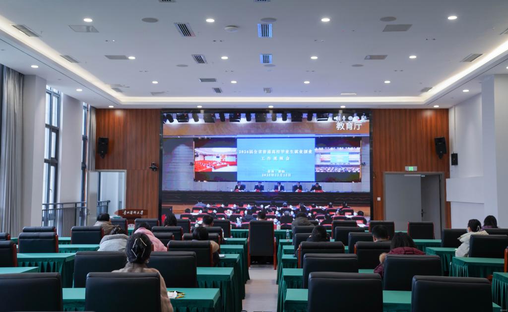 12月25日,贵州省委教育工作领导小组秘书组、省教育厅组织召开2026届全省普通高校毕业生就业创业工作视频会议。我校在云漫湖校区知雨楼7楼视频会议室设立分会场,校党委书记汤磊、相关职能处室负责人、各学院党政负责人及招生就业处全体工作人员参加会议。